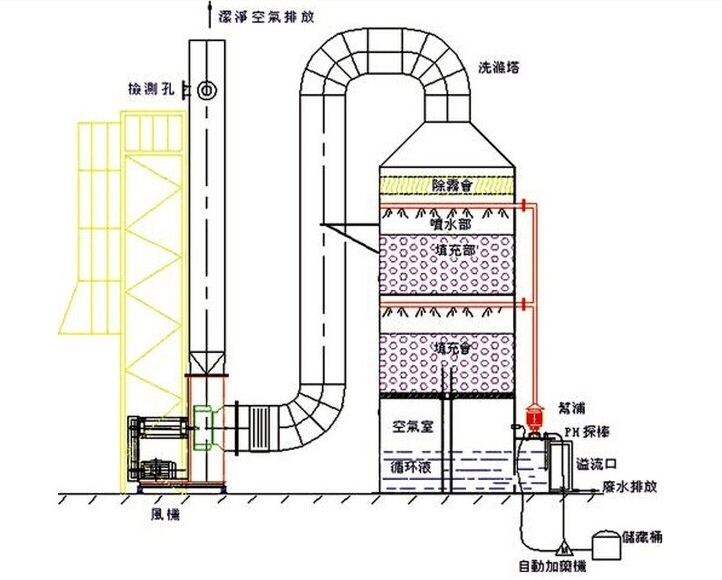 本工艺所采用的填料式吸收法就是利用增大气液两相的接触面积来提高效率的,当粉尘/废气/油雾与药水液体大面积的接触后,废气中的污染物被药水液体吸附、吸收,从而与洁净气体分离,达到净化的目的。