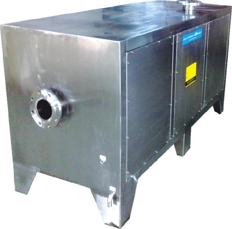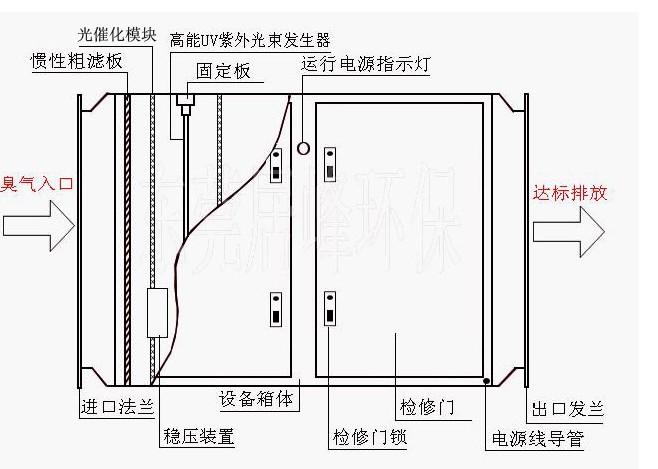 工业废气利用排风设备输入到高效光解氧化处理模块后,净化设备运用高能UV紫外线光束及臭氧对废气进行协同分解氧化反应,使废气中的恶臭气体物质降解转化成低分子化合物、水和二氧化碳,再通过排风管道排出室外。具体地来说就是,高效光解氧化处理模块利用高能UV紫外线光束分解空气中的氧分子产生游离氧,即活性氧,因游离氧所携正负电子不平衡所以需与氧分子结合,进而产生臭氧。臭氧对有机物具有极强的氧化作用,对恶臭气体及其它刺激性异味有立竿见影的清除效果。